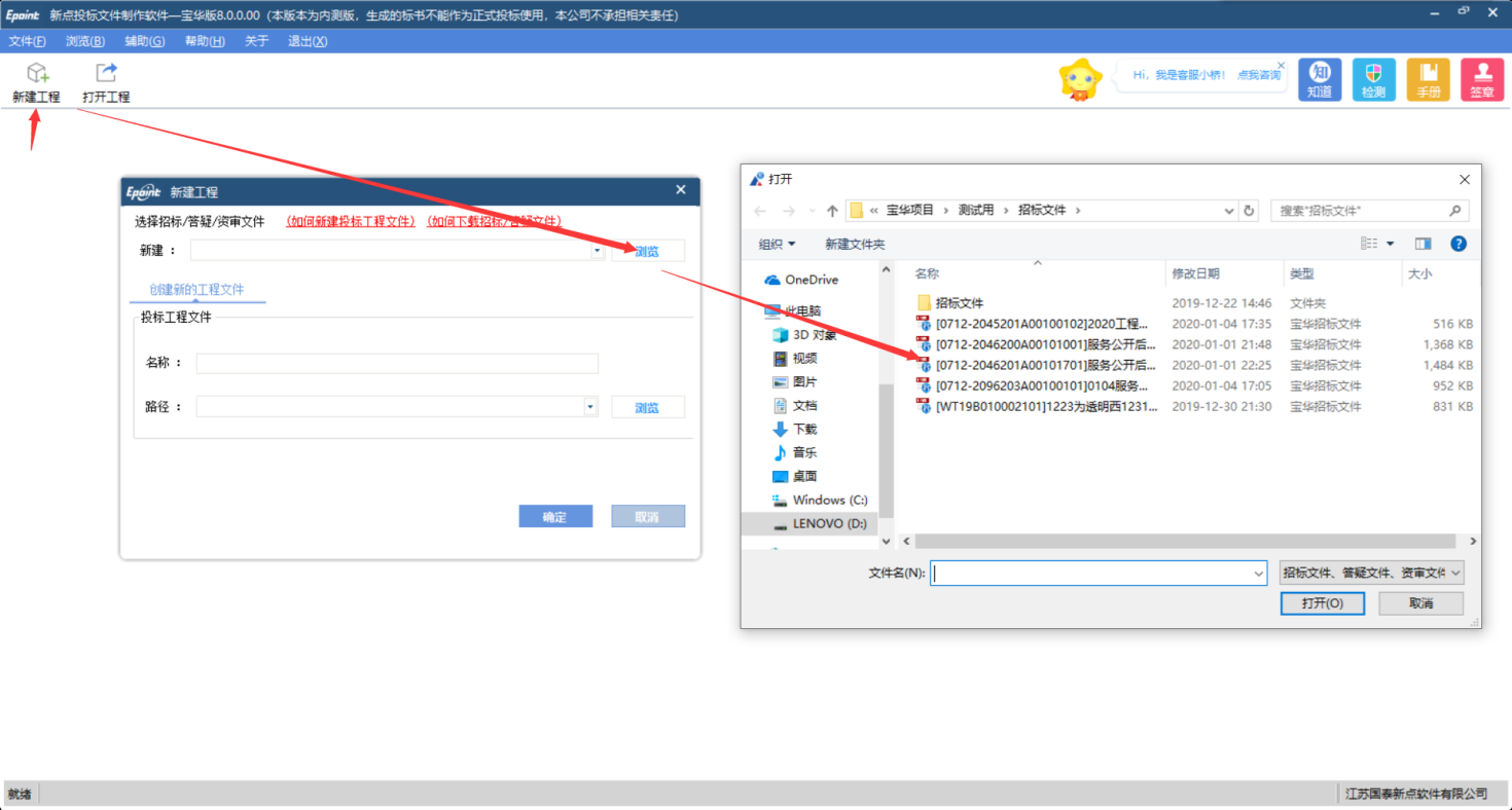 点击工具栏上的 <新建工程>,点击 <浏览> 选择招标文件(*.BHZF 格式)或者答疑文件(*.BHCF),点击 <打开>。
