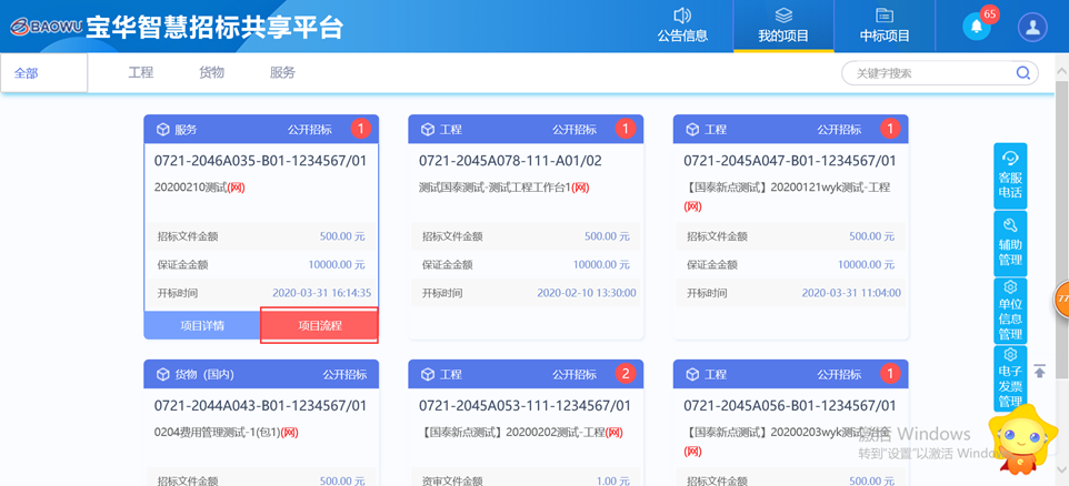 1.在“我的项目”内找到对应项目,点击“项目流程”按钮,进入“项目流程”页面,